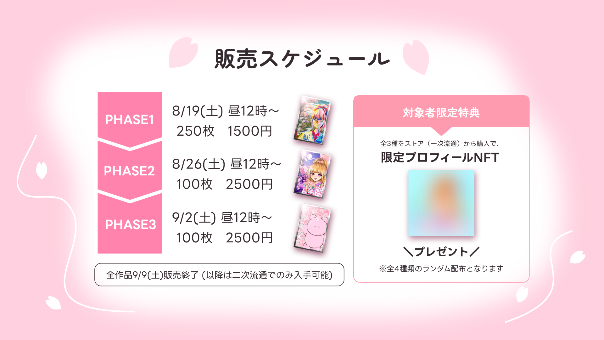 3週連続で発売するNFT、「サクラノスマイ Japanese Edition」、「サクラノスマイ × Kiyora 」、「サクラノスマイ × ましゅくま」を全てLINE NFTのストア(一次流通)で購入していただいた方に、限定プロフィールNFTをエアドロップ(プレゼント)します。なお、このプロフィールNFTも二次流通が可能です。
