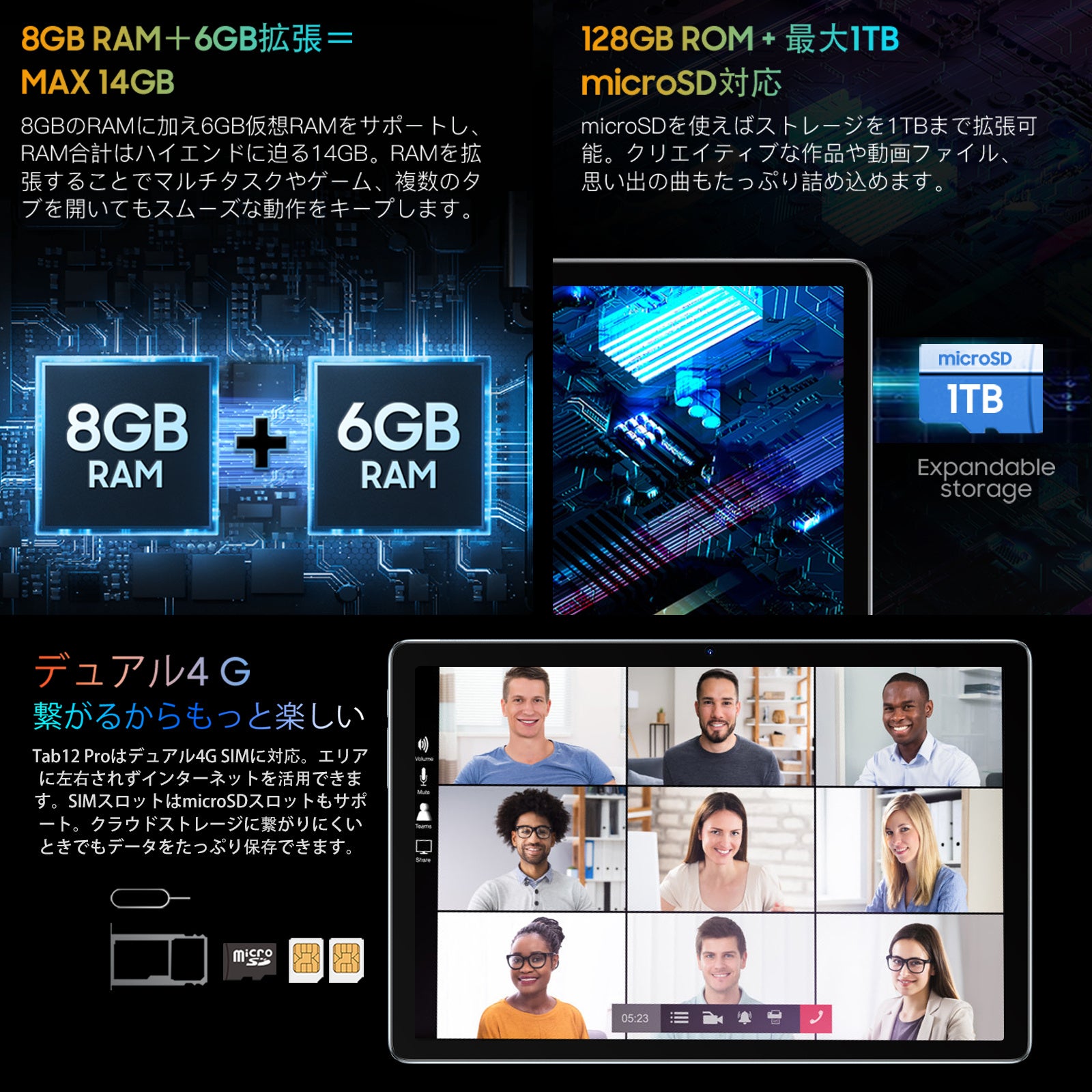 Blackview Tab12Pro Android 12 タブレットは、14GB RAM(8GB+6GB拡張)と128GBの高速ストレージを搭載し、アプリケーションをすばやく起動し、超高速でスムーズな操作体験を楽しむことができます。更に、最大1TB TFカード(FAT32形式、別売り)の容量拡張に対応し、ほとんどの主流アプリの高速処理に満足できます。Tab12proタブレット 10インチ容量を気にせず、ゲーム、映画、音楽、ドラマ、Kindle、マンガ、写真などを思う存分お楽しみいただけます。また、デュアル 4G LTE 通話をサポートし、TD-LTE および FDD-LTE 4G ネットワークをサポートし、仕事と生活を自由に切り替えることができます。