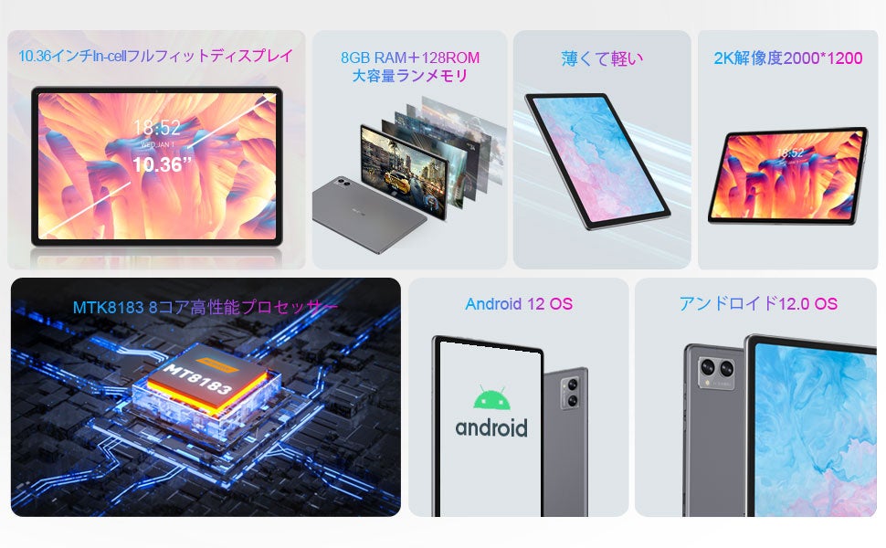 【MTK 8183 8コアCPU+8GB+128GB】このタブレットは、MTK 8183 8コアCPUと8GB RAM、128GBストレージを搭載しています。MediaTek 8183は、低消費電力の12nmプロセスで構築され、高性能なA73アーキテクチャの高性能コアを4つ備えています。Antutuベンチマークでは最大23万点をマークし、大型ゲームもスムーズに動作します。さらに、128GBのストレージ容量で、アプリ、動画、写真などをたくさん保存することができますので、容量の心配もありません。