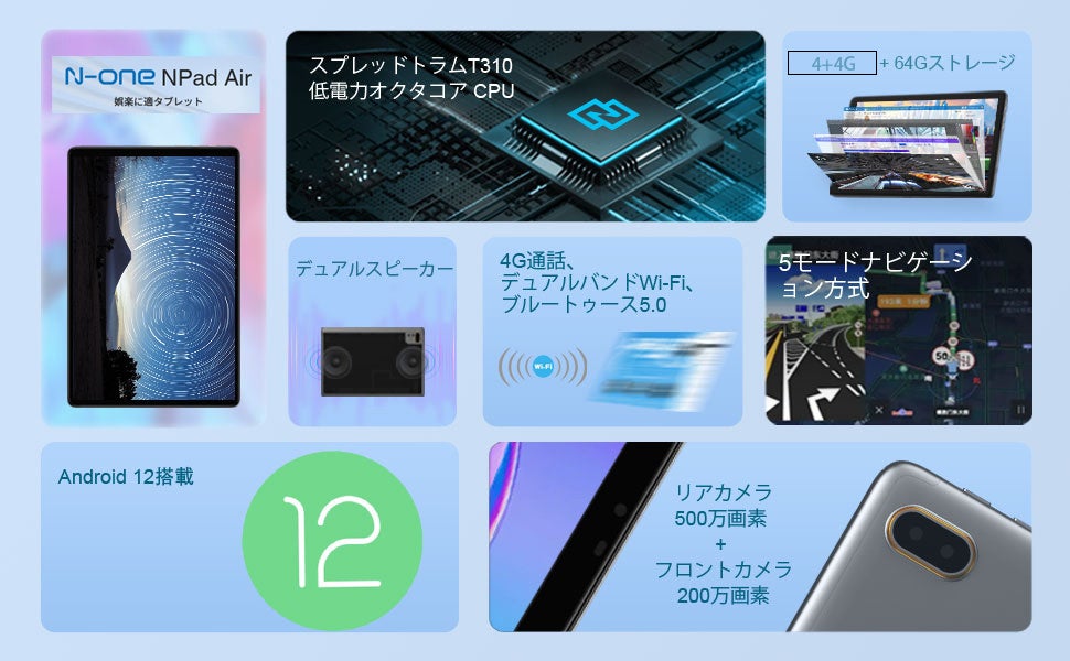 タブレット アンドロイド Android 12、N-one NPad Air タブレット 10インチ wi-fiモデル、RAM 4GB/ROM 64GB、2.0GHz T310CPU、1920*1200解像度 FHD IPSディスプレイ、4G LTE モデルタブレットPC、GMS認証+Type-C+Bluetooth 5.0+GPS+2.4G/5G WiFi+6600mAh+最大1TB TF拡張、日本語取扱説明書付き