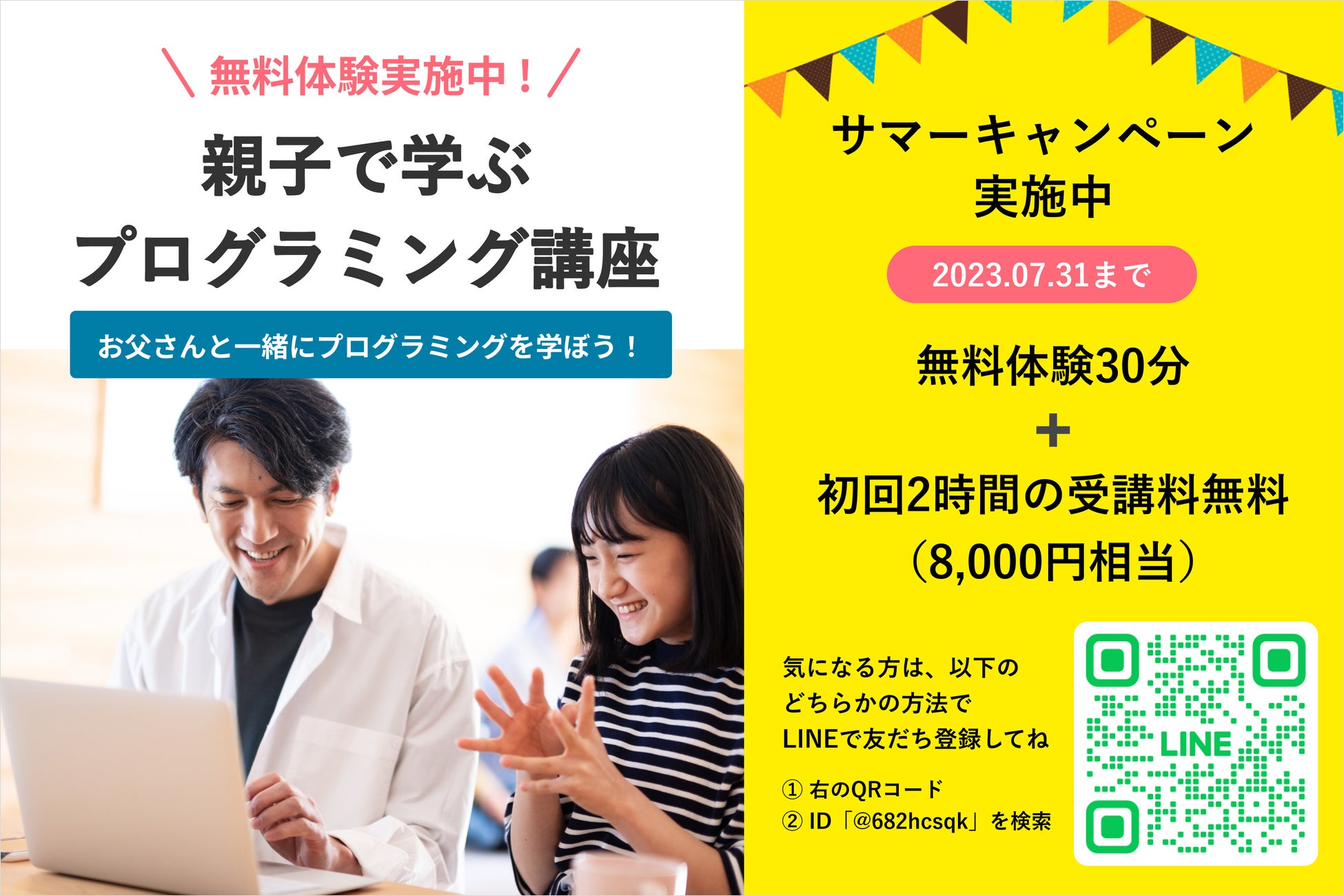 初回お申し込み2時間分無料キャンペーン実施中! 7月中にお申し込みいただいた方は初回の2時間分の受講が無料になります。子供と一緒にプログラミングを学びたいお父さん、忙しい日々でコミュニケーションに悩んでいるご家庭にぜひおすすめです。