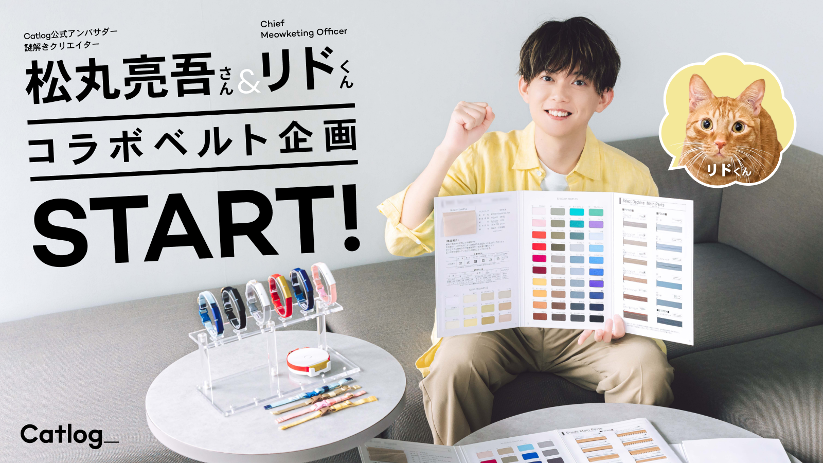 先日Catlogの公式アンバサダーにご就任いただいた謎解きクリエイターの松丸亮吾さん、CMOに就任したご愛猫のリド様とのコラボ第1弾として、Catlogベルトを一緒に企画・開発するプロジェクトがスタートしました。