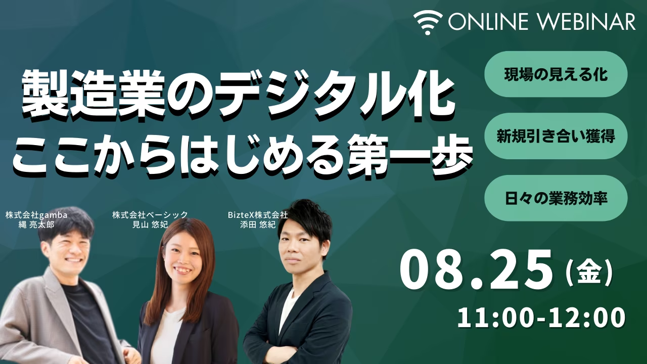 そこで今回、Webサイトから引き合いを獲得するためのマーケティング支援を製造業含め1,300社以上支援してきたベーシックと、スタッフ間のコミュニケーション改善の方法を累計15,000社に提供してきたgamba社、製造業の現場で日々行われる業務の自動化を2,000社以上支援してきたBizteX社が、デジタル化を進める初めの一歩となる課題整理の方法から具体的な進め方を、成功事例を交えてご紹介いたします。
