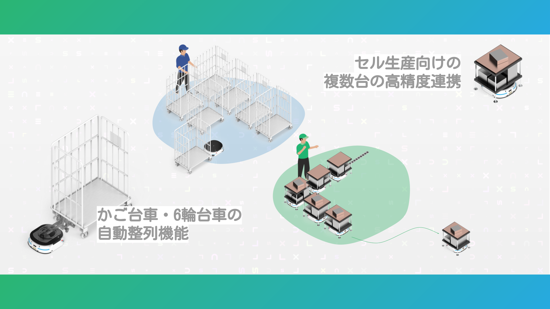 Kawasaki-LABでは、製造工場および物流センターで利用できる機能の開発及びデモを実施することができます。既存の物流センターで利用できるかご台車や6輪台車の自動整列機能や、自動車工場を始めとする生産現場で利用できるセル生産向けの高精度連携技術等、AMR(Autonomous Mobile Robot)の現場活用イメージが湧くようなデモをご覧いただくことができます。