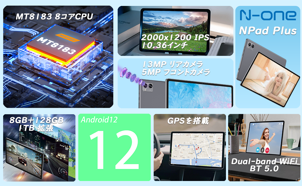 Android 12搭載 / 10.36インチタブレット / MTK 8183 8コアCPU 2.0GHz / 8GB RAM+128GB ROM+1TB TF拡張可能 / 2000*1200 2K解像度 FHD IPSディスプレイ / 13MP+5MPデュアルカメラ / GMS認証 / 2.4G/5G Wi-Fi対応 / Bluetooth5.0 / GPS