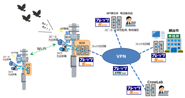 カラスが集結・ねぐらとする北越谷駅周辺で、遠隔地からのICT技術を利用した警戒音声により、カラスの飛散(分散)等を目指します。スピーカをはじめとした機器を電柱に設置し、実施エリアの拡大やセキュリティ対策を考慮したICT装置・制御ネットワークを構築します。