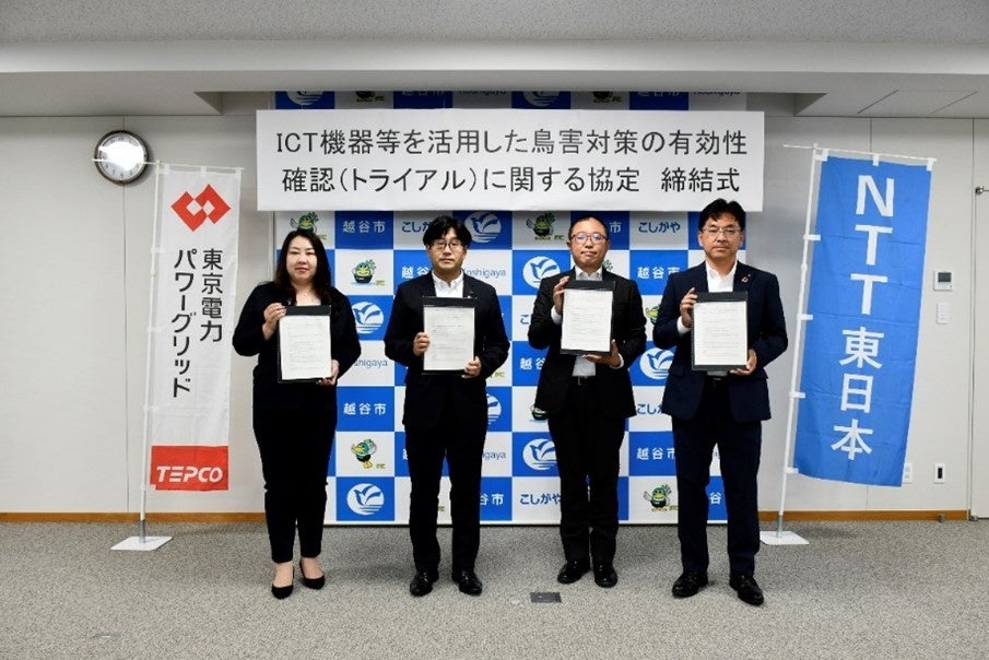 越谷市(市長 福田 晃)、株式会社CrowLab(代表取締役 塚原 直樹 以下「CrowLab社」)、東京電力パワーグリッド株式会社 川口支社(川口支社長 渡部 恵美 以下「東京電力パワーグリッド」)、東日本電信電話株式会社 埼玉南支店(埼玉南支店長 花石 啓介 以下「NTT東日本」)は、越谷市内のカラスによる被害を減らし、住環境における地域課題を解決していくため、ICT技術等を活用した有効性確認の4者連携トライアルを開始することから、2022年7月14日に、協定を締結いたしました。今後は、本協定に基づき地域課題の改善に向け、取り組みを推進してまいります。