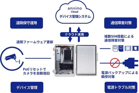 「厳しい環境下でも安定的に動作」「障害時もリモートで対応」「最大4つのSIMを利用可能」などの特徴を持つLinux OS搭載のLTEゲートウェイです。アムニモの映像ソリューションはAIカメラが検知したイベント情報を取り込み可能です。またPoE給電やSSDへの録画、クラウドからの映像を視聴できるため、AIカメラがより使いやすくなります。