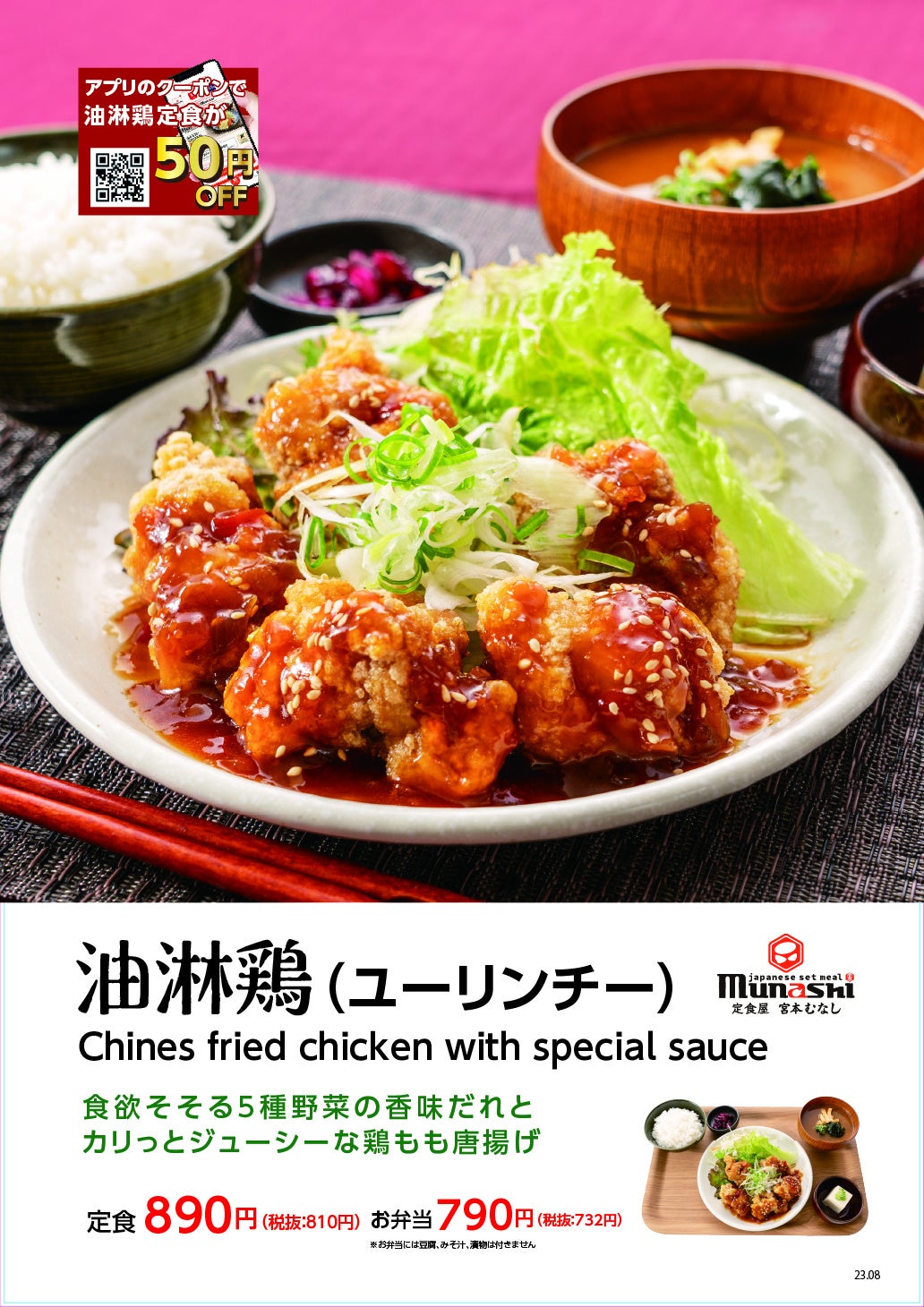 宮本むなし公式アプリでは「油淋鶏(ユーリンチー)定食」50円引きクーポンを配信いたします。