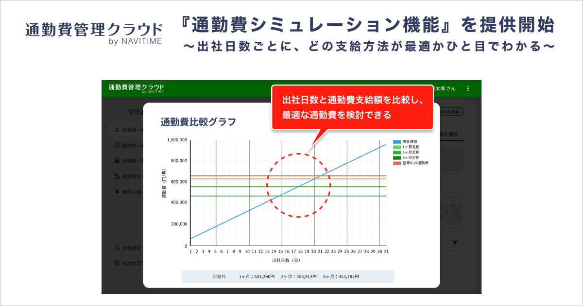 また、紙の書類やExcelなどで従業員の通勤費を管理している企業では、複数の支給方法ごとのシミュレーションデータを作成するのにも、膨大な時間と手間がかかると考えられます。本サービス・本機能を提供することで、通勤費の管理や変更が簡単にできるだけでなく、さらに通勤費コストの最適化を図る支援ができるのでは、と考えております。