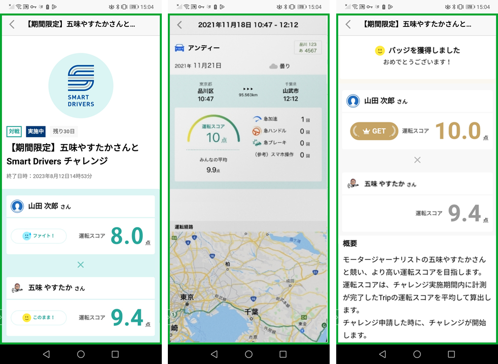 Smart Driversチャレンジに参加すると、参加期間中、五味やすたかさんとアプリ内でフレンド(※2)になって運転スコアを競うことができます。見事期間内に五味やすたかさんの運転スコアを上回ることができると、Smart Drivers認定バッジをゲットすることができます。