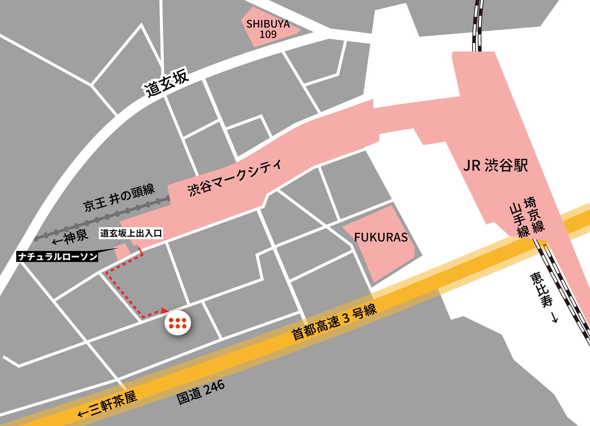 アクセス:京王井の頭線、東京メトロ、JR各線「渋⾕」駅下車。渋谷マークシティ「道玄坂上」出入口から徒歩2分