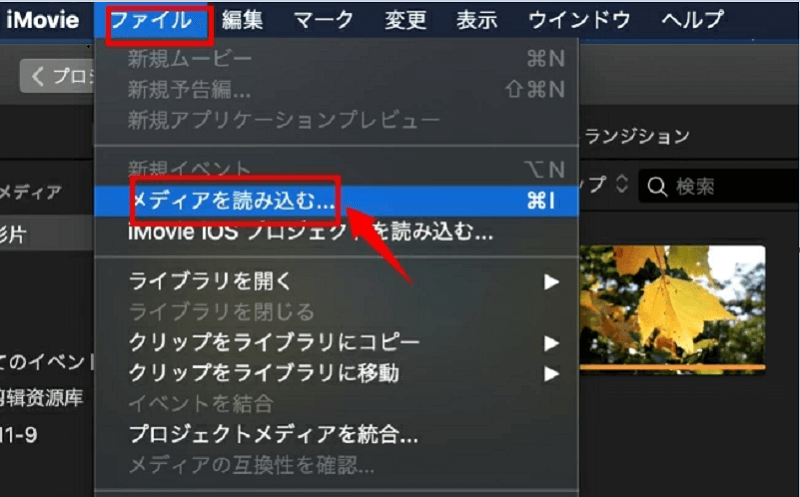 ステップ1、iMovieを立ち上げ、ベッドサイドの「ファイル」をクリックし、「メディアを読み込む」を選択します。