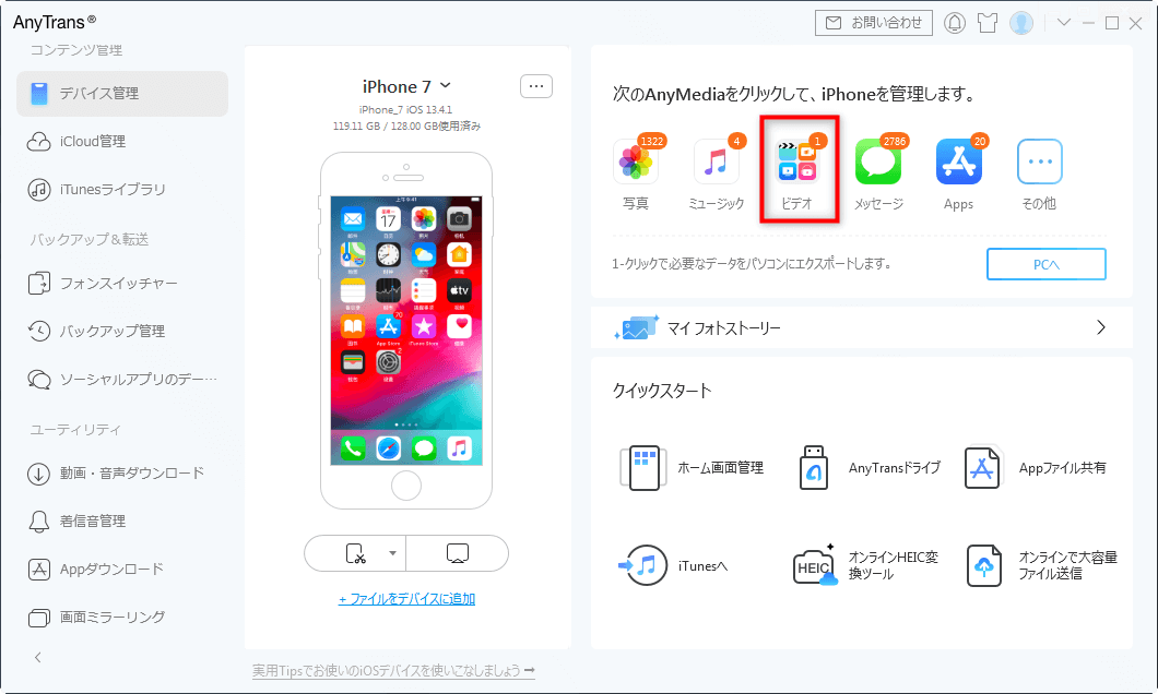 ステップ1、パソコンにAnyTransを無料ダウンロードし、インストールしてから、iPhoneと接続します。そして「ビデオ」をクリックします。