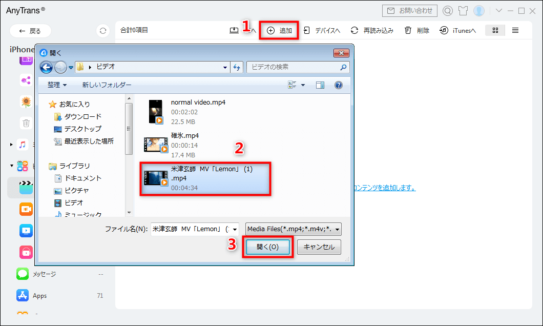 ステップ2、「追加」ボタンをクリックし、iPhoneあるいは他のデバイスに転送したい動画を選択し、「開く」をクリックします。
