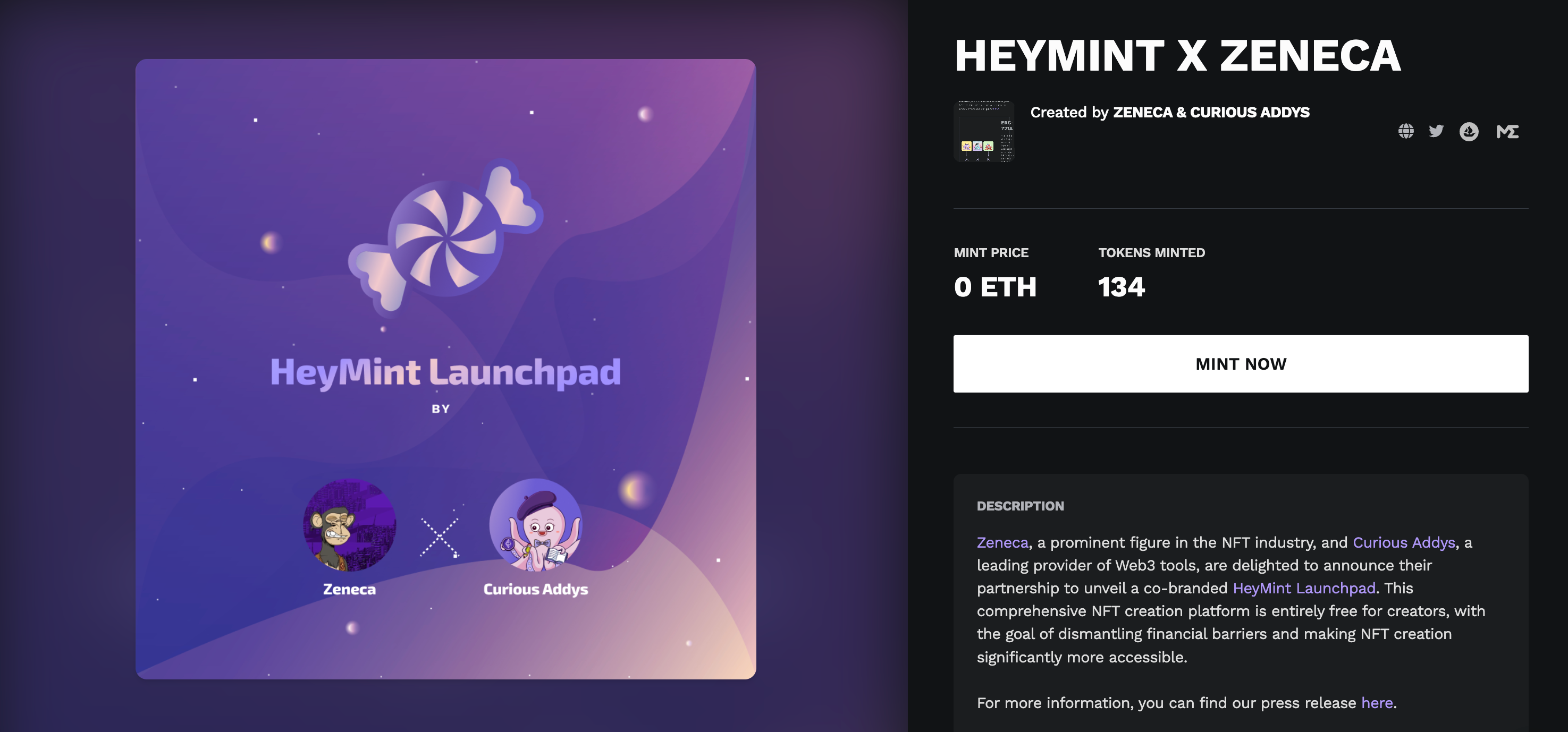 HeyMintは、アーティストやクリエイターが無料で簡単にNFTコレクションを立ち上げることができるノーコードNFTローンチパッド兼アローリスト管理ツールであり、2021年にCurious Addy’s Trading Clubからローンチされました。