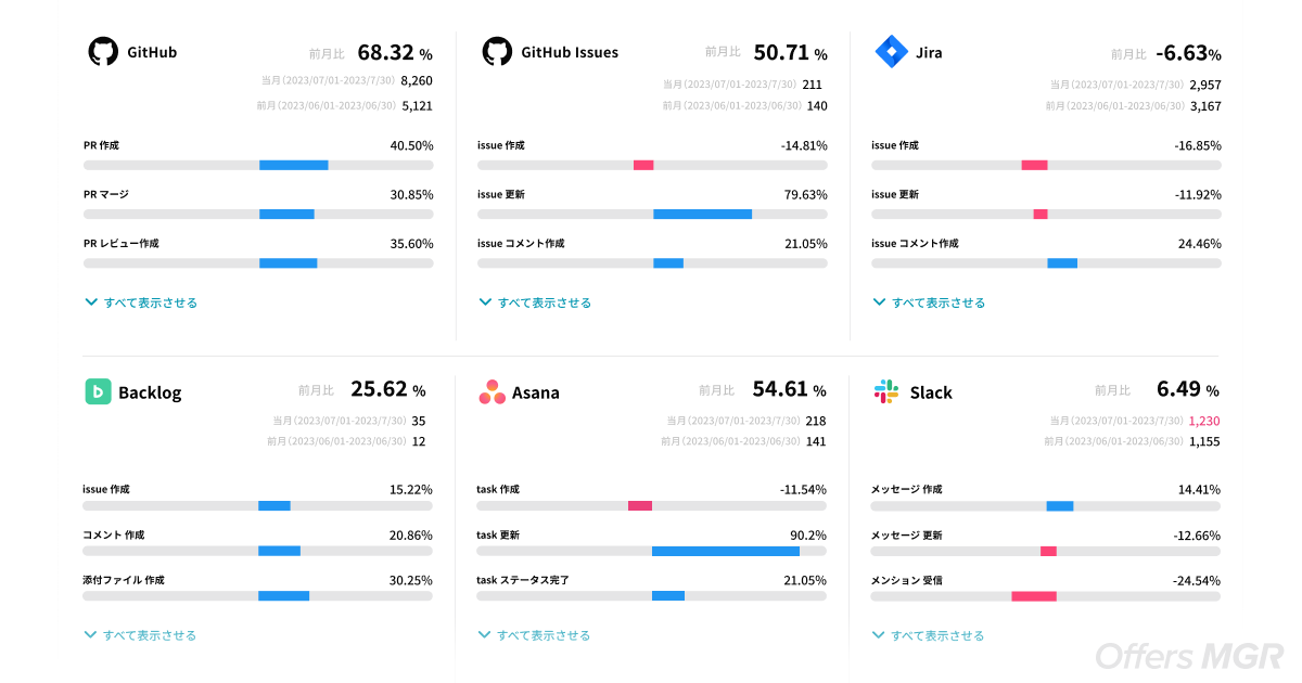 「Offers MGR(https://offers-mgr.com/lp/)」は、プロダクト開発組織の生産性向上を最大化するサービスです。GitHub・Jira・Figmaなどの開発業務で利用するサービスや、Slack・Notionなどのコミュニケーションツールからデータを抽出し、個人やチームのアクティビティやパフォーマンスを可視化することで、作業効率の見直しや個々のモチベーション管理に役立てることができます。さらに、ITエンジニア/デザイナーの副業・転職サービス「Offers」と連携することで、雇用形態別でのメンバーのコミットメントが可視化され「副業転職」の支援も実現します。