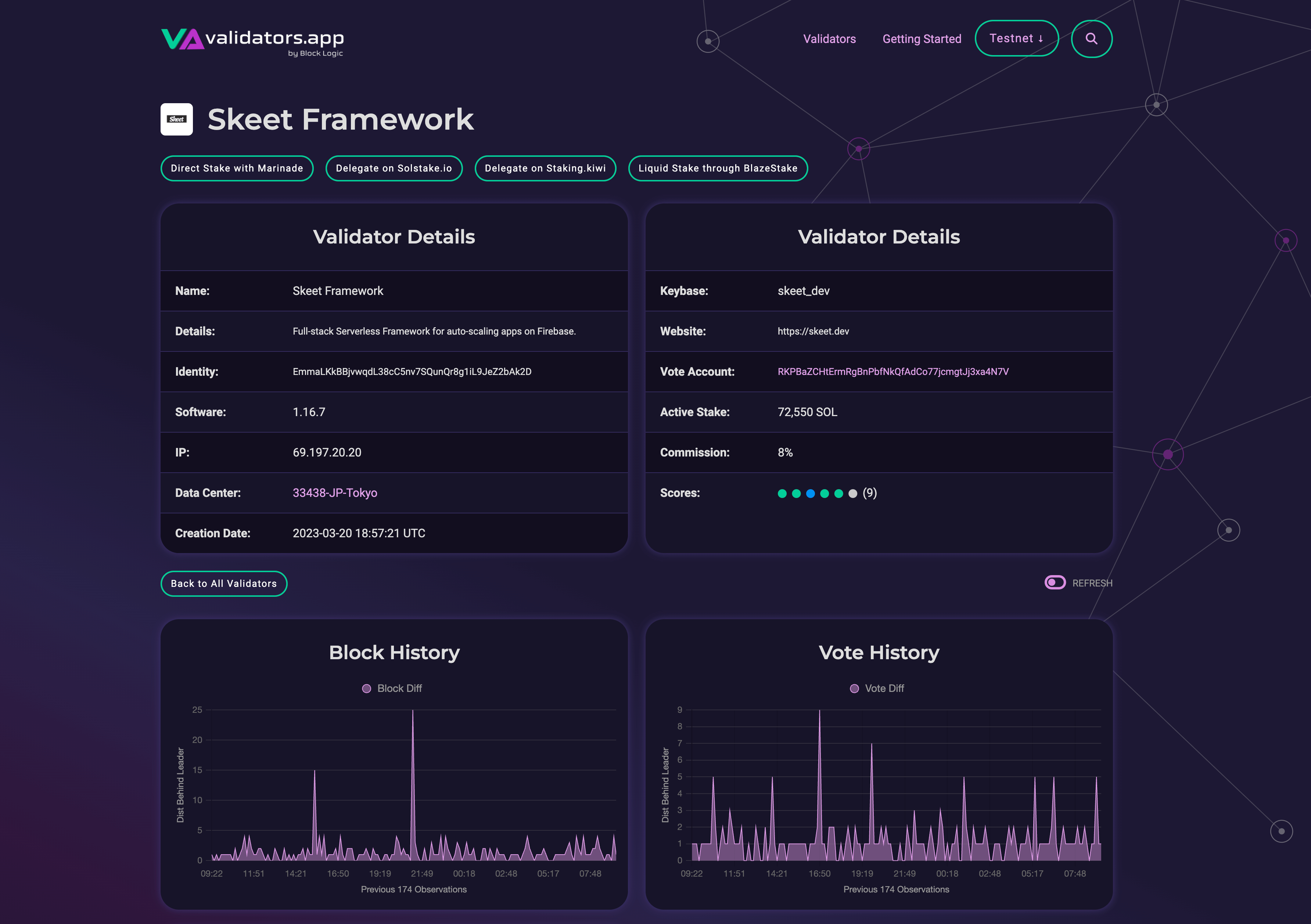 Solana Validators (Skeet Framework): https://www.validators.app/validators/EmmaLKkBBjvwqdL38cC5nv7SQunQr8g1iL9JeZ2bAk2D?locale=en&network=testnet