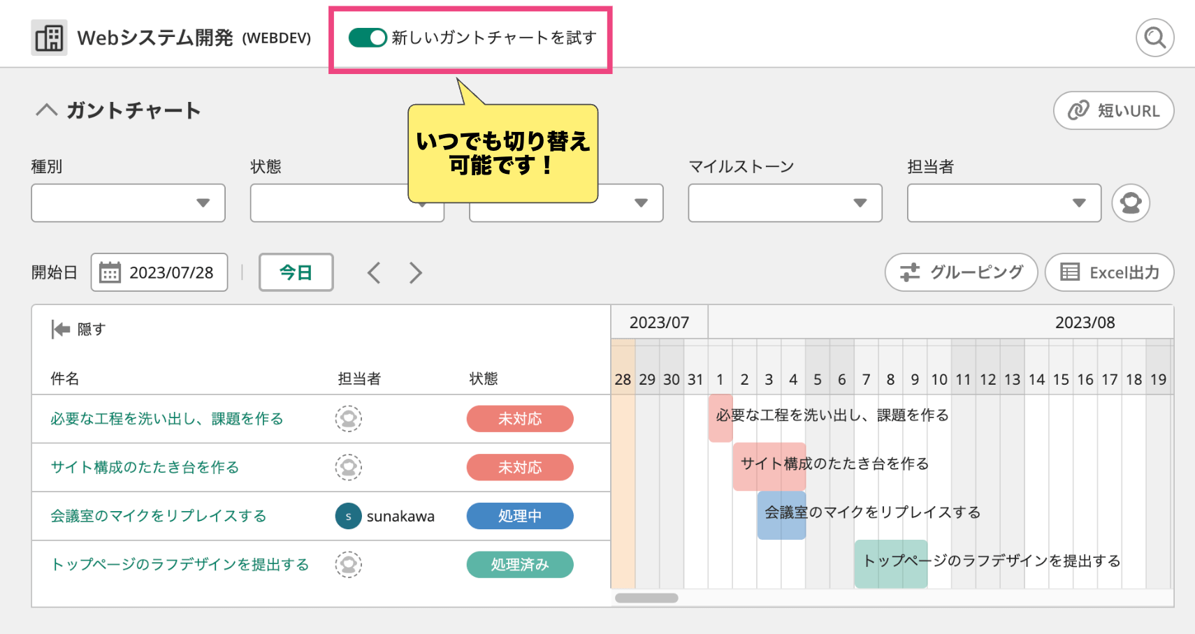 新しいガントチャートは画面上部のトグルボタンを切り替えることで利用できます。β版としての提供期間中は、いつでも新旧のバージョンを切り替えてお使いいただくことが可能です。