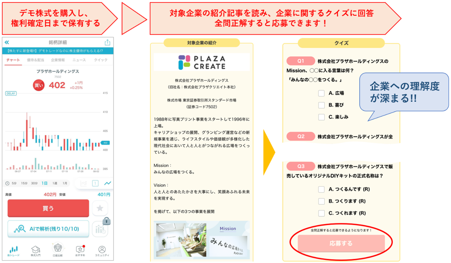 「株たす」で対象企業のデモ株式を購入・保有し、応募フォームの企業クイズに全問正解した方の中から抽選で「株主優待」と同等の商品をプレゼントいたします。