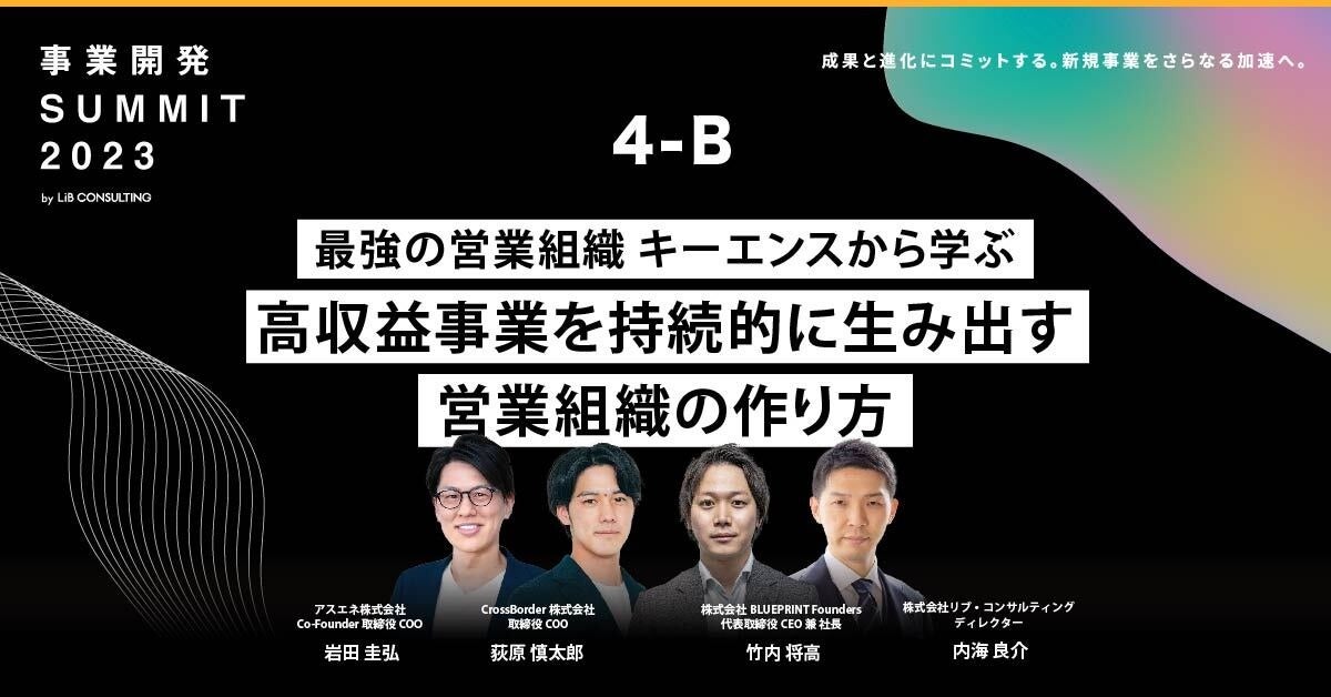 今回の事業開発SUMMIT2023では、同様にキーエンス在籍時に高い成果をあげたアスエネ 岩田氏、BLUEPRINT 竹内氏とともに、キーエンスから学んだ「成長事業を持続的に生み出す営業組織の作り方」についてお話します。