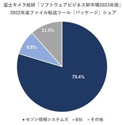 富士キメラ総研の調査によると、2022年度のファイル転送ツールの国内パッケージ市場規模は85億円で、そのうちセゾン情報システムズは市場シェア79.4%を記録、20年連続で市場シェアNo.1を獲得しました。同分野において引き続き圧倒的な支持を得られていることが読み取れる結果となりました。国産ベンダーとして、製造業・流通業・金融業・情報通信業など幅広い業種で高い実績があり、特に公共(官公庁/自治体)向けの実績も拡大しています。