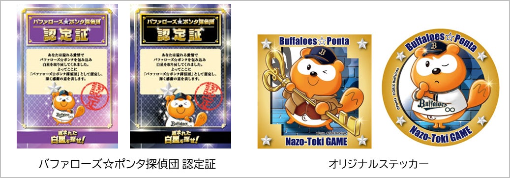 バファローズ☆ポンタDAY会場内の謎解き特設ブースで、「バファローズ☆ポンタ×謎解きゲーム 盗まれた白星を探せ」の冊子に「最後のキーワード」を記入した状態でご提示いただくと、「バファローズ☆ポンタ探偵団認定証」を進呈します。また試合当日、謎解きゲームキットを購入された方に、オリジナルステッカーをプレゼントします。