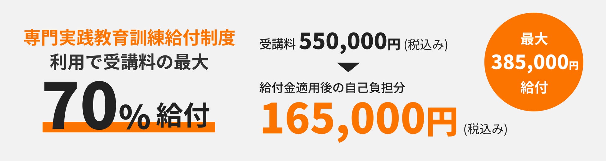 本コースを受講するにあたって専門実践教育訓練給付金制度の給付条件を満たすことで、支払った受講料の最大70%が給付金として支給されます。