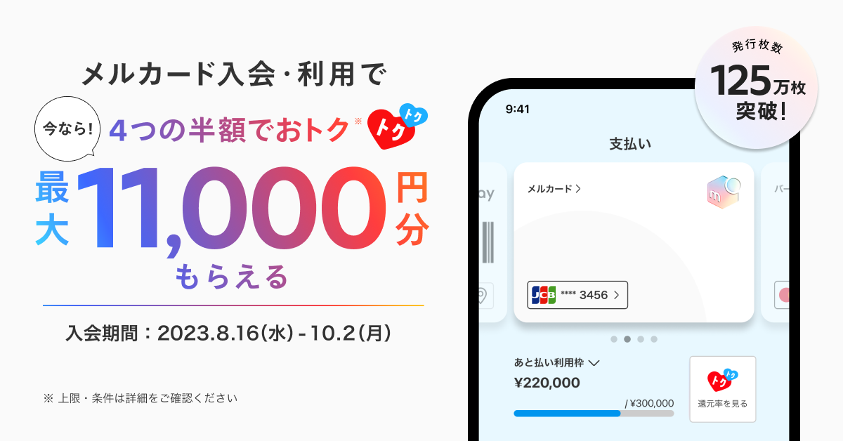 (1)[特典 買う]「メルカリ」でのお買い物で使える2種類の半額クーポン ▼概要 対象期間中に「メルカード」に入会すると、「メルカリ」のお買い物で利用できる2種類のクーポンを付与します。「メルカリ」での商品ご購入時にクーポンを使用し、「メルカード」でお支払いいただくと購入金額が最大50%値引きされます。 ※クーポンごとに値引き額の上限があります ※「メルカリ」のお買い物で利用できるクーポンの付与タイミングはそれぞれ異なります ▼クーポンの種類とクーポン利用可能期間 1回目:50%OFFクーポン(上限5,000円) 利用可能期間:2023年8月16日(水) 00:00〜2023年10月2日(月) 23:59 2回目:50%OFFクーポン(上限2,000円) 利用可能期間:2023年10月3日(火) 00:00〜2023年10月31日(火) 23:59 ※2回目の「50%OFFクーポン」は条件達成後、2023年10月3日(火) 以降に順次付与されます。付与後、利用が可能となりますのでご注意ください 条件等の詳細は末尾からキャンペーンページへアクセスしてご確認ください。 (2)【特典 支払う】お店での支払いで最大半額分のポイント還元(上限2,000ポイント) ▼概要 街のお店・ネットショップで「メルカード」または「メルペイスマート払い」をご利用いただくと、お支払いいただいた購入代金(手数料等を除く元金)の50%相当分のポイントが還元されます。(上限2,000ポイント) 条件等の詳細は末尾からキャンペーンページへアクセスしてご確認ください。 (3)[特典 売る]「メルカリ」で出品して売れると販売手数料が半額分還元される(上限1,000ポイント) ▼概要 2023年8月16日(水) 00:00から2023年10月2日(月) 23:59までに「メルカード」に入会し、キャンペーン期間中に新規で「メルカリ」に出品した商品が売れた場合、販売手数料の50%相当分のポイントが後日還元されます。(上限1,000ポイント) ※キャンペーン開始日より以前の出品についてはポイントの還元対象外です 条件等の詳細は末尾からキャンペーンページへアクセスしてご確認ください。