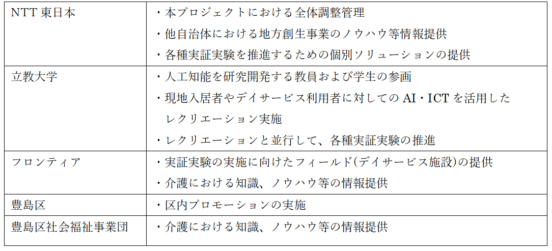 NTT東日本、立教大学、フロンティア、豊島区、豊島区社会福祉事業団の5者は、産学官共同で2019年より介護AIプロジェクトを始動させ、分析、検討を進めてまいりましたが、この度こうした現状を踏まえ、主にデイサービス利用者の方々へ、AIやICT(ロボット・VR)を活用した新規レクリエーションを提供する共同実証を開始することとなりました。