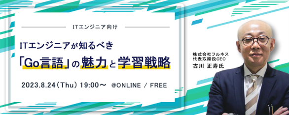 本セミナーでは株式会社フルネスの代表取締役CEOの古川氏を迎え、「Go言語(golang) 」について、「歴史や特徴」またその「価値」や「習得ステップ」についてご説明します。