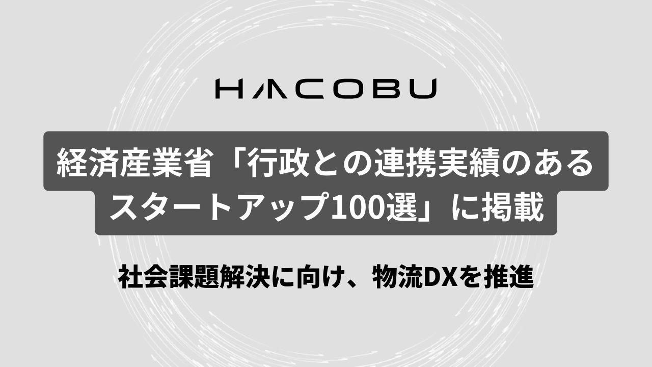 参考:2023年4月18日のプレスリリース 経済産業省が発表する「行政との連携実績のあるスタートアップ100選」に掲載されました。Hacobuは今後も行政との連携を強化しながら、物流の社会課題解決に向けて、物流DXを推進します。