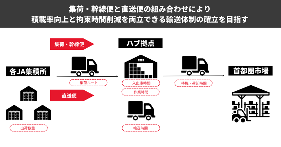 各JA集積所での出荷数量をはじめ、集荷ルート、ハブ拠点への入出庫時間、ハブ拠点での作業時間、ハブ拠点から首都圏市場に輸送する際の待機時間・荷役作業卸時間、輸送時間など、取得したデータを分析しサプライチェーン全体の最適化に取り組みます(図表参照)。