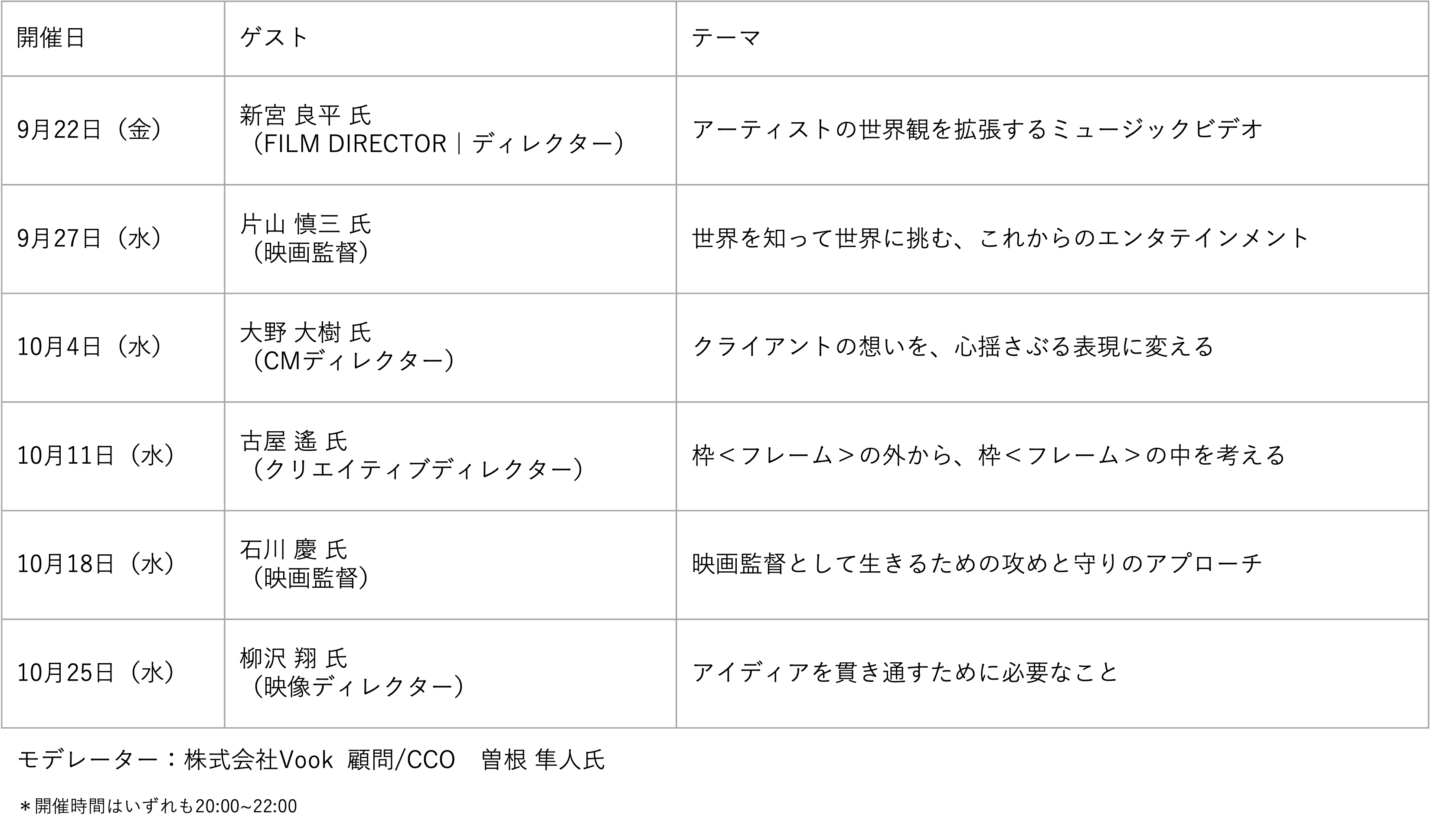 今回その取り取り組みの一環として、「ディレクター」「カラリスト」の2つの職種にフォーカスした短期集中講座『Vook Master Studio』を開講いたします。本講座は、最前線で活躍する映像クリエイターをゲストに迎え、これまでなかなかオープンにされていなかった、仕事を進める上での考え方や視点、手法などをお話しいただくことで、映像業界で生き抜くためのヒントを掴んでもらうための講座です。