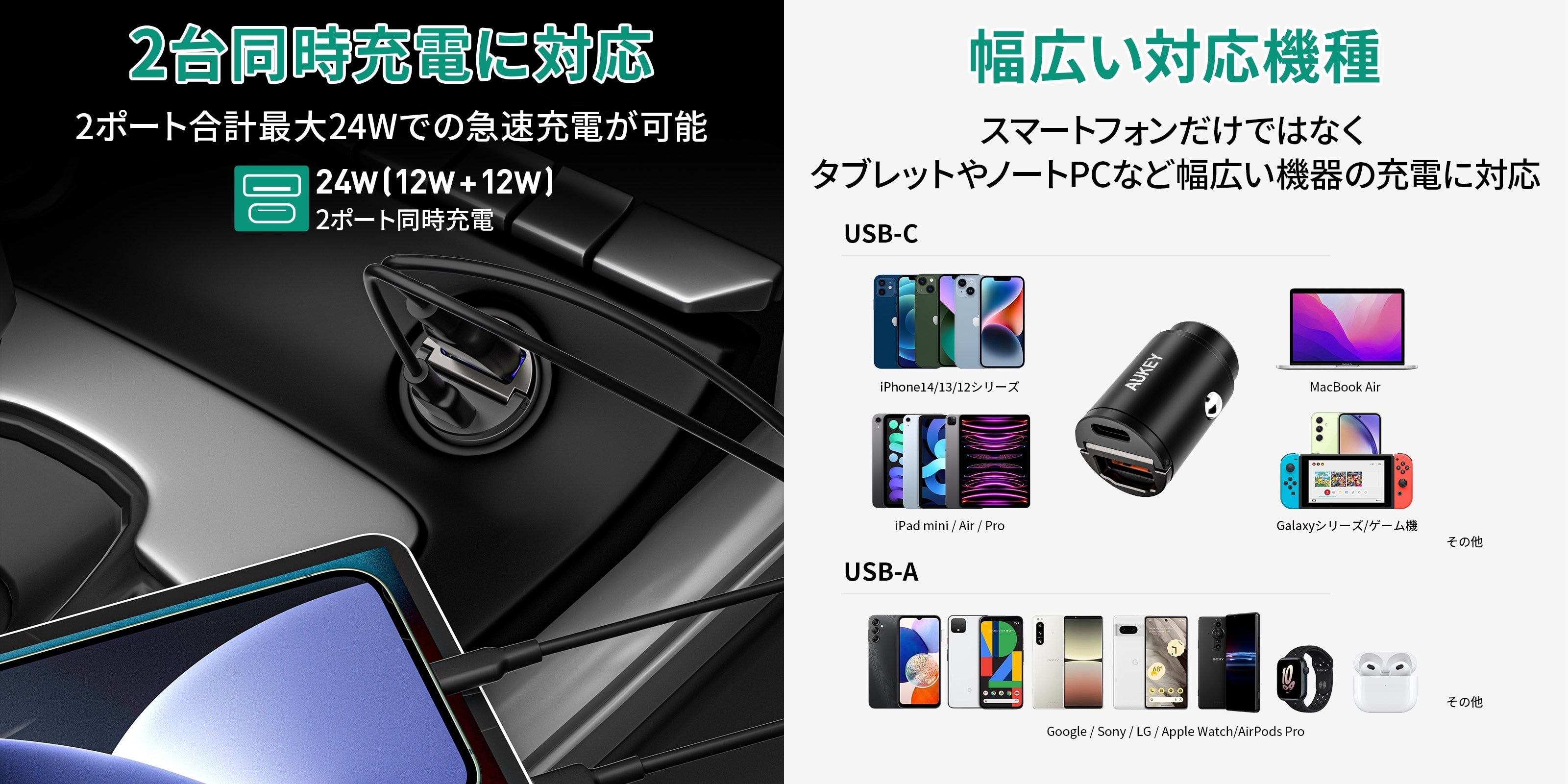 2つのUSB-Cポートを搭載し、2台の接続機器を同時に充電できます。2ポート同時使用時は合計最大24Wのハイパワー出力が可能です。さまざまなUSB-C機器の充電に対応し、スマートフォンやタブレットはもちろん、ゲーム機器やデジカメなどの充電にもおすすめ。自分のスマホを充電しながら、同時に家族のゲーム機を充電するなど、車内に充実の充電環境を提供します。