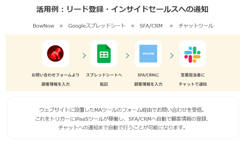 BowNowで取得したリード情報を、自動で複数のツールに登録し、瞬時にインサイドセールスへ通知が可能。