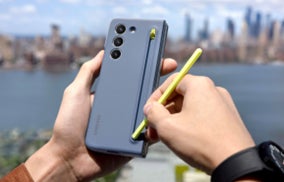シリーズ最速のプロセッサーを採用し、7.6インチ折りたたみ式メインディスプレイ搭載のGalaxy Z Fold5は、マルチタスクと高い処理性能を備えています。画面の開閉角度は自在に調整でき、「フレックス・モード」では、メモを取りながらビデオ通話ができます。ワコムのEMR技術を搭載し、さらにスリムでコンパクトになった新しいSペン フォールド・エディション(1)により、外出先でメモを書いたり、絵を描いたりと、Galaxy Z Fold5をキャンバスのように活用することも可能です。Sペンは、さらにスリムさを増したケース(2)に入れて携帯でき、手軽に直感的な操作でメモを取ったり、書類にサインしたりするなど、用途に合わせて活用することができます。