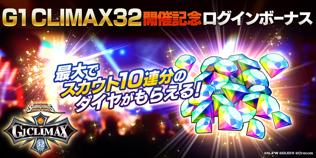 G1 CLIMAX 32 開催記念として、最大で1,500ダイヤ(10連スカウト1回分)が獲得できる期間限定ログインボーナスが開催中。