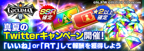 G1 CLIMAX 32 開催記念として、Twitter連動の新日SS内で1,500ダイヤやSSR確定パートナースカウトチケットなどが交換できるキャンペーンを開催中。