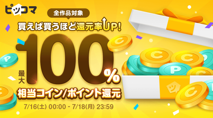 この度、電子マンガ・ノベルサービス「ピッコマ」では7/16(土)0:00〜7/18(月)23:59の3日間限定で、全作品を対象に購入すれば購入するほど還元率がアップ。最大100%相当還元の超お得なイベントを実施いたします。尚、本イベントはアプリ、WEB両方で実施いたします。