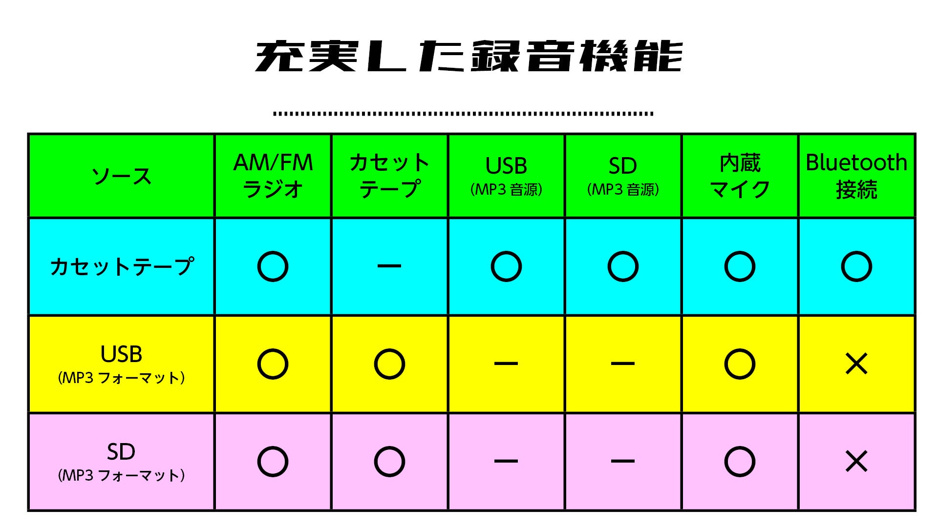 USBメモリーやSDカードにMP3フォーマットで録音ができます。もちろんカセットテープへの録音も可能なので、オリジナルカセットテープの作成も楽しめます。
