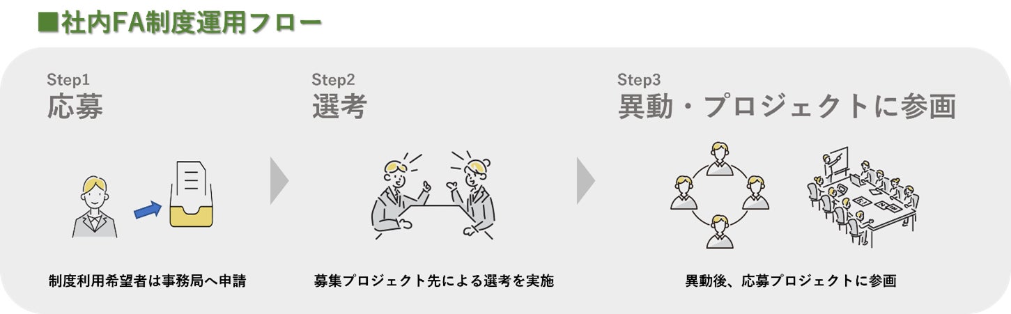 社内FA制度は、全部署を対象に自ら募集プロジェクトへ異動申告ができる制度です。本人からの応募の後、募集プロジェクト先による選考を実施したうえで、新たなプロジェクト・業務に従事することができるようになります。