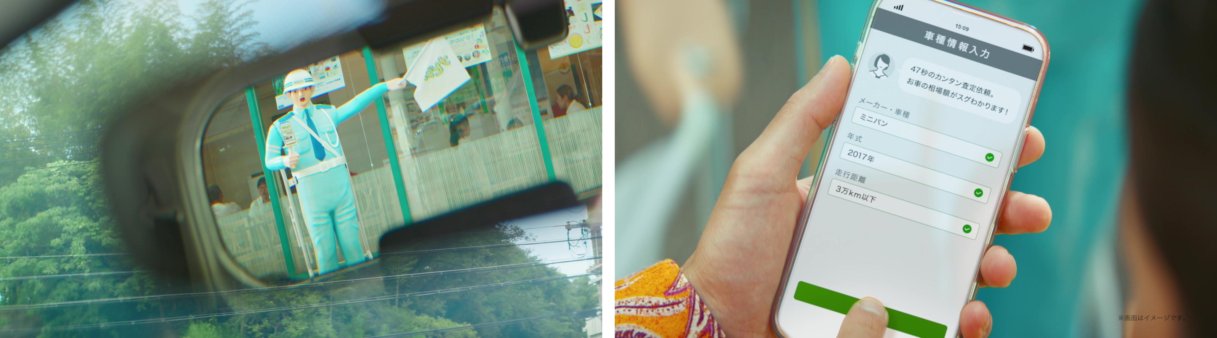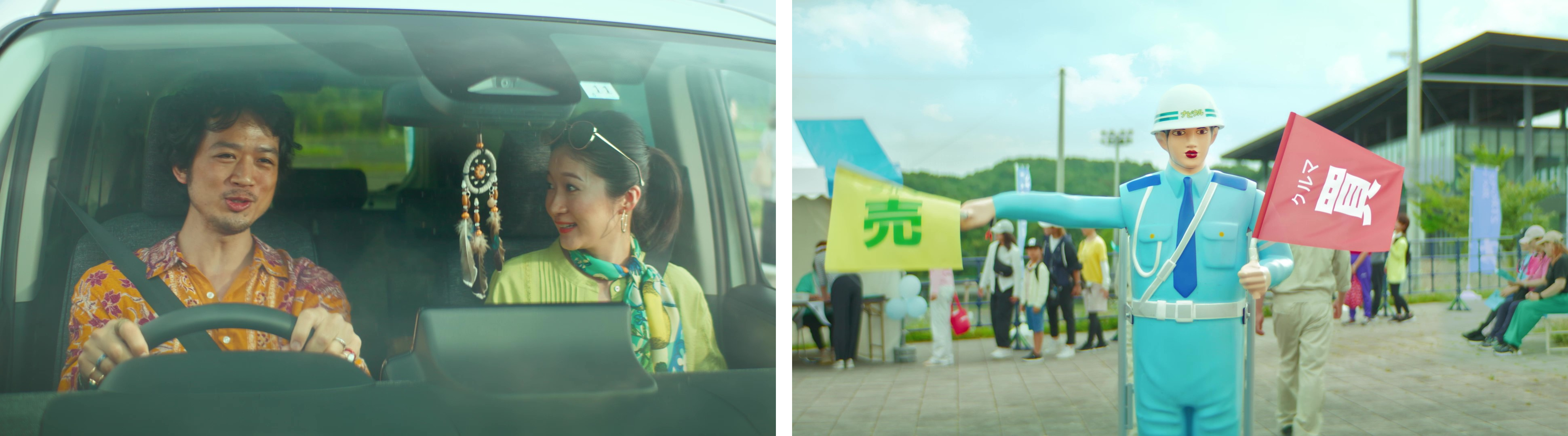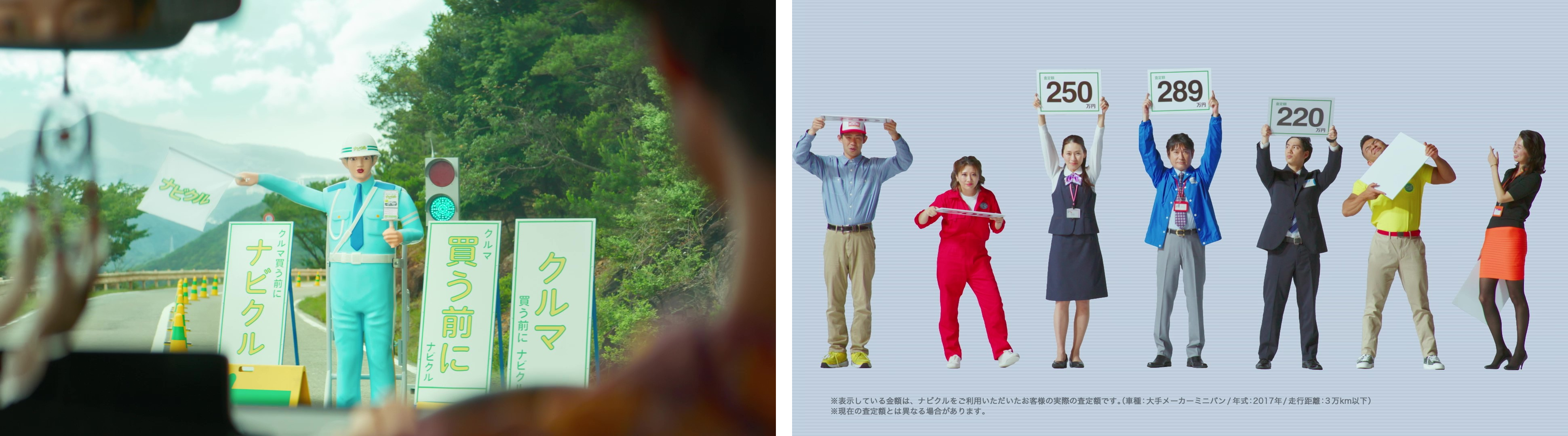 今回の新CMでは、道路上で交通整理を行う姿が広く知られている「安全太郎」が登場します。無機質な表情の中に漂う独特な雰囲気が人気の安全太郎が、車の購入に悩む夫婦2人をナビクルの一括査定へ「誘導」します。ナビクルをご利用いただくことで、車の乗り換えがどれほどお得になるのかを旗やピコピコハンマーを用いながらユーモラスに伝えています。