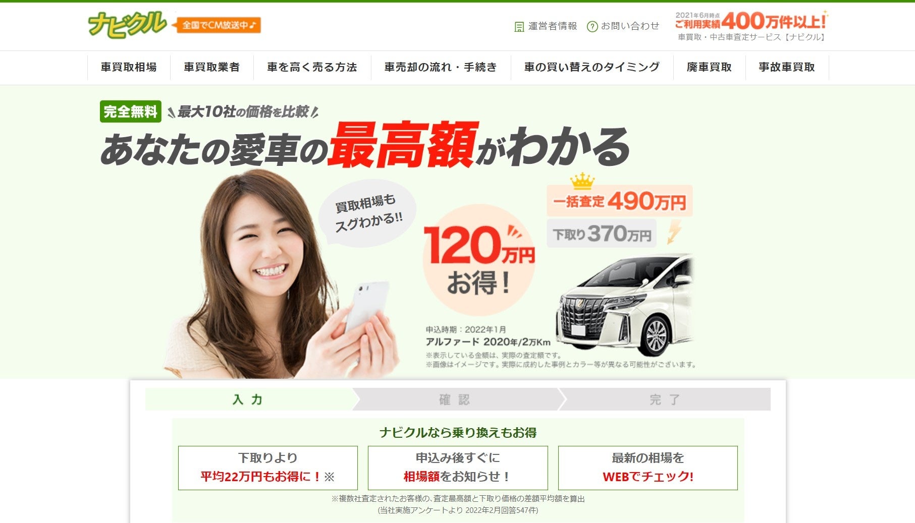ナビクルは、一度の情報入力で最大10社の中古車買取店の査定額を比較して、より愛車を高く売ることができる中古車一括査定サイトです。
