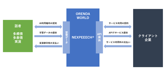 また、ORENDA WORLDは、AIにおける学習データの利益還元を想定したスキームを構築しており、音声データの学習に貢献している声優へ実演家印税を売上から還元する仕組みを運用しております。今後、著名な声優話者の場合においても、ライセンスビジネスを行える手助けについて検討しています。