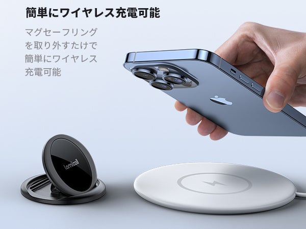 小さなボディで驚くべき安定感を発揮。本製品には、約1400gまでの荷重に耐える強力マグネットを使用しました。リングに指を入れるだけでスマートフォンを落とす恐怖から完全に逃れられます。また、iPhone14やiPhone13などのMagSafe シリーズをお使いの方やMagSafe搭載ケースをお使いの方は、そのままリングを装着していただけます。