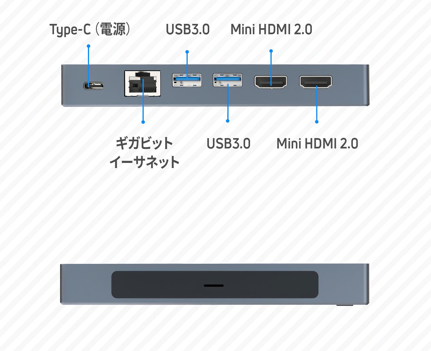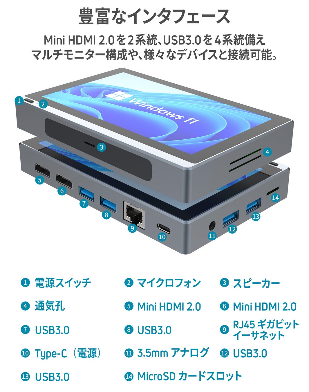 インターフェース: Mini HDMI 2.0×2、USB 3.0×4、Type-C 3.1(電源)、MicroSDカードスロット、3.5mmオーディオ