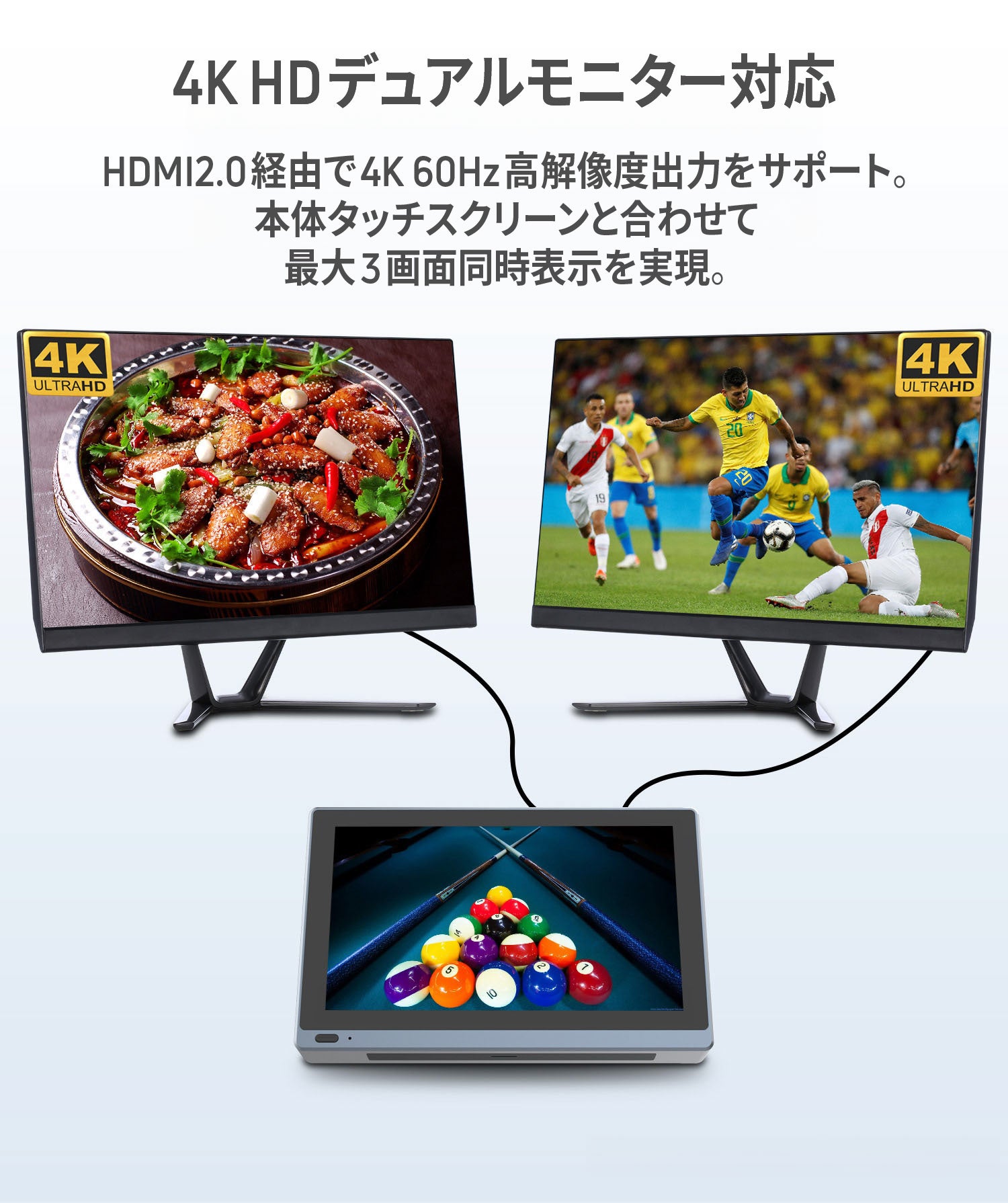 ● HDMIを備え4K 60Hzで外部モニター2台と接続。本体タッチスクリーンと合わせてトリプルモニターを実現。