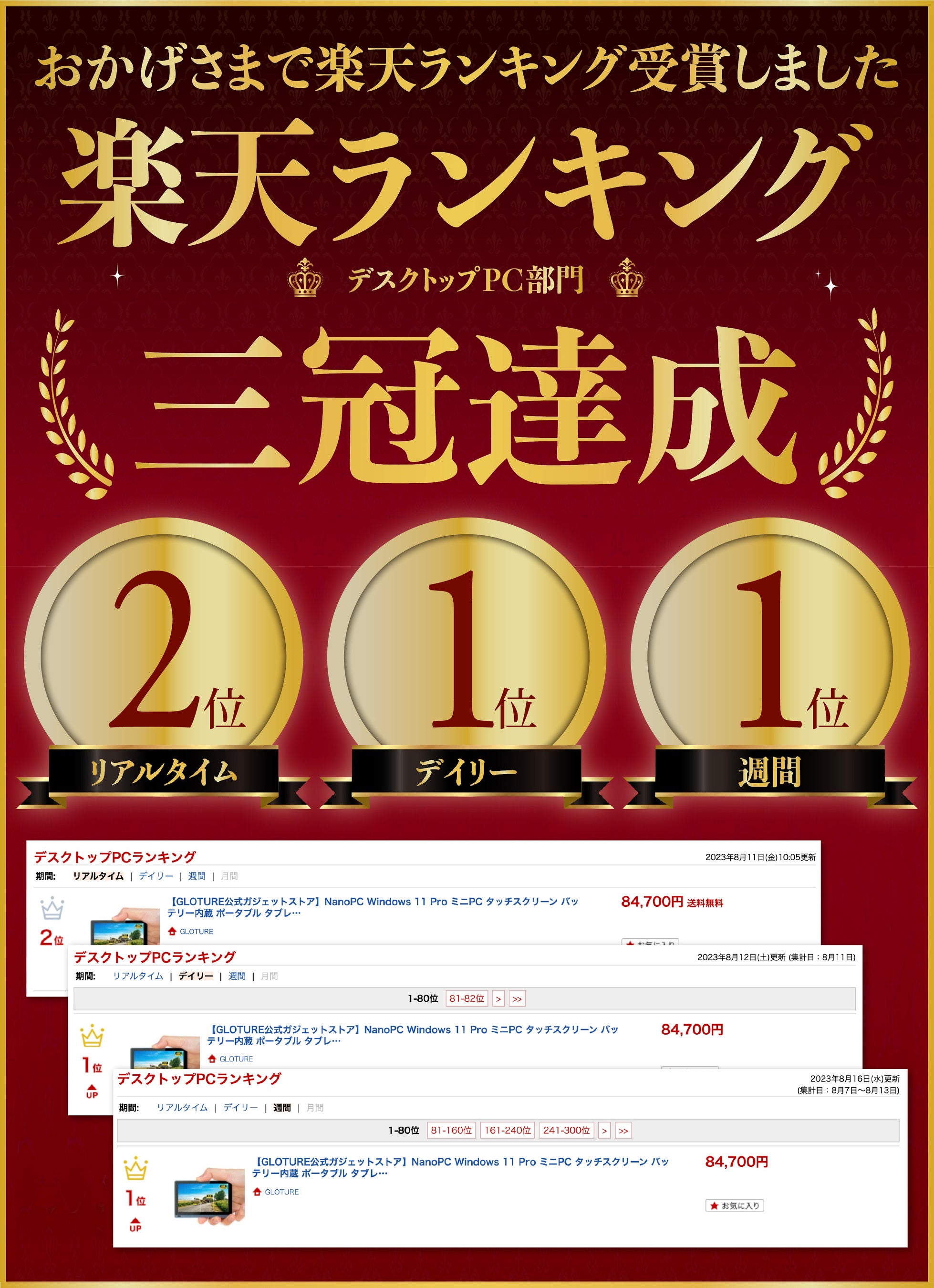当社 株式会社Gloture(グローチャー)は近未来のライフスタイルを提案するショップ「Gloture 楽天ストア」を運営しております。 この度、タッチ画面&バッテリー内蔵のユニークな特徴が人気のミニPC「NanoPC」が楽天市場ランキングにて三冠を獲得しました事をお知らせします。 カテゴリー:デスクトップPC部門 期間:週間1位 集計日:2023年8月7日(月)から13日(日) 2023年8月16日(水)更新 期間:デイリー1位 集計日:2023年8月11日(金) 2023年8月12日(土)更新 期間:リアルタイム2位 2023年8月11日(金) 10:05更新 |