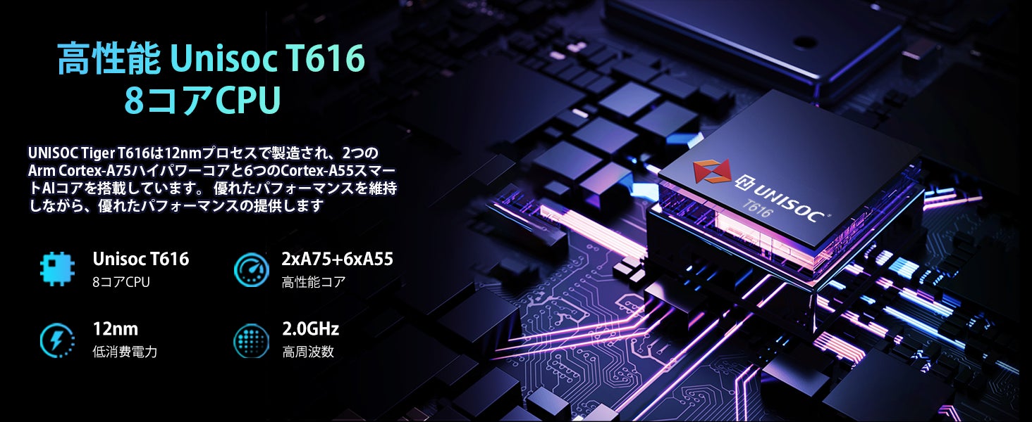 12nmプロセスの8コアUNISOC T616高速プロセッサーを搭載し、A75アーキテクチャーのコアを採用、最大2.0Ghzの周波数をサポートする。 強力なMali G57ゲーミンググレードグラフィックスプロセッサーを搭載し、日々のエンターテインメント用途の需要に応えることができる。